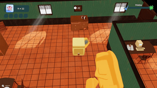 When the player uses the suction mechanic, they will also get smaller items. After a few items, they start to move slower. To get rid of the items they have to shoot them out, causing more chaos in the process. To teach this mechanic we made doors in the apartment that are only destroyed by shooting items at them. The room where the player starts acts as tutorial where they have to shoot the door to continue. To add to the playfulness, the player also gets pushed back when shooting.