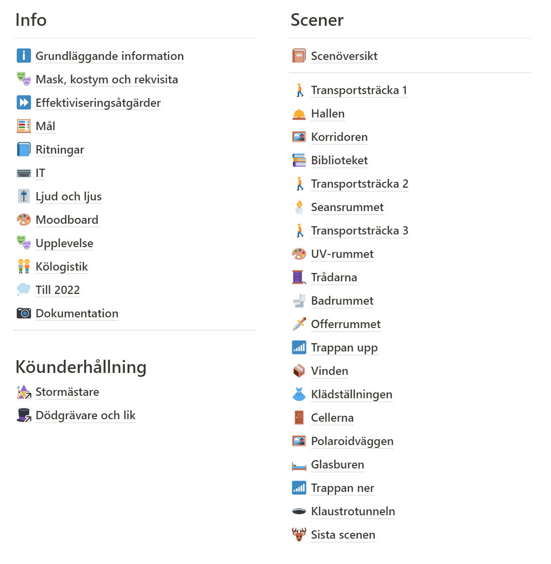 For each of the haunted houses I created a separate Design Document. The idea was that everybody from construction workers to management could have access to these so that everybody was on the same page and preparations could be done efficiently while maintaining quality. I chose Notion for these documents so they could be easily shared with relevant partners, updated in real time and being able to set and remove permissions as needed. Some examples of what was included:
