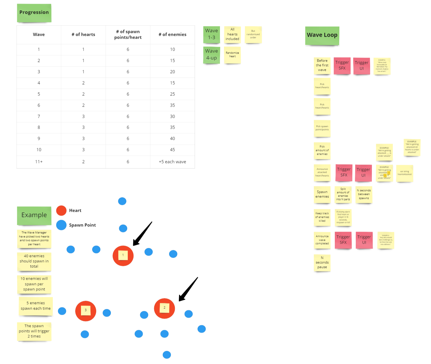 For the real Wave System, one of the programmers was assigned to develop it. To get started we had a meeting where we wrote down every step of a wave. This could then be used by all team members when implementing some part of the system, like dialogue triggers for example. The system was then continuously playtested and adjusted during the rest of the project.